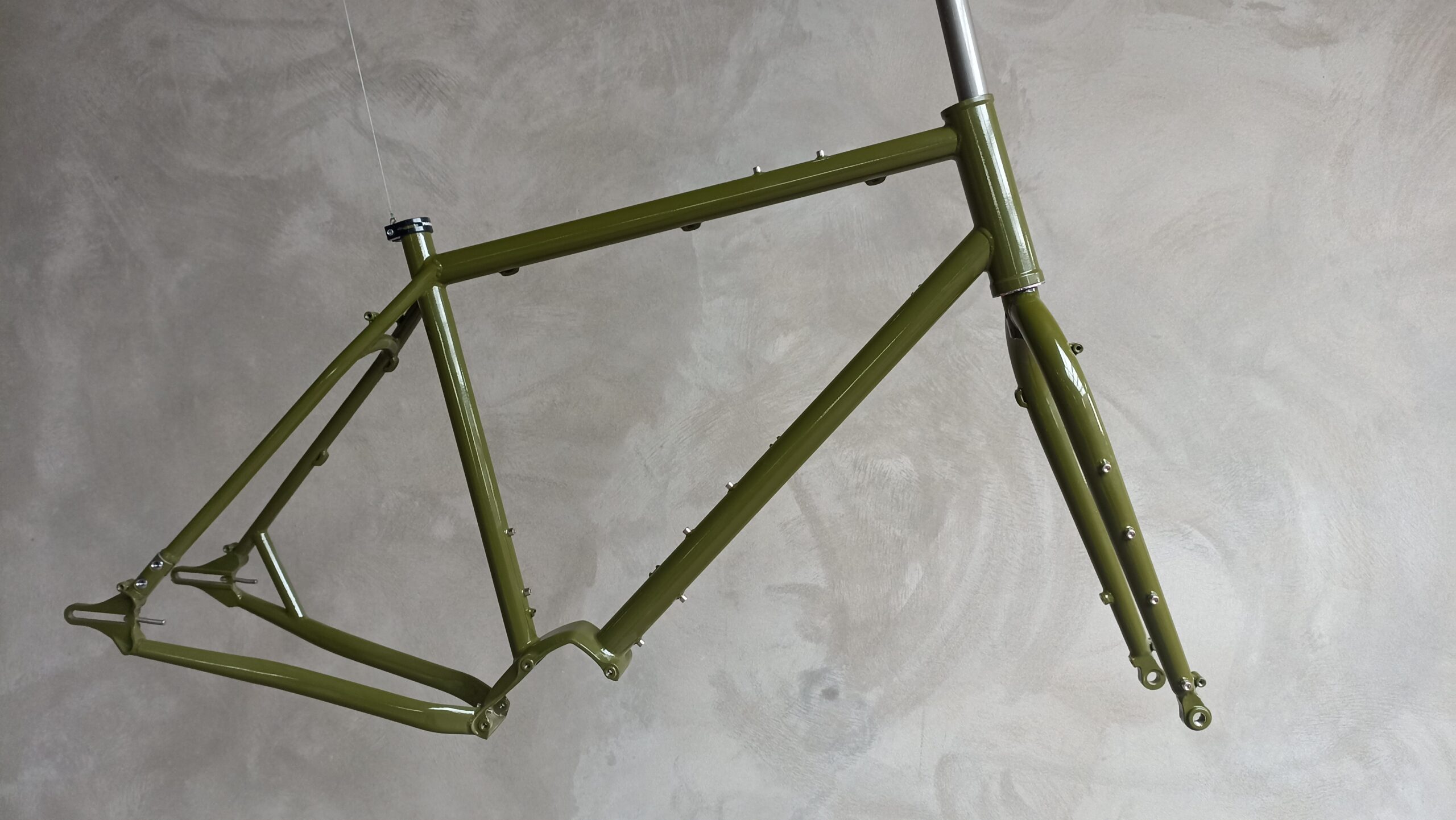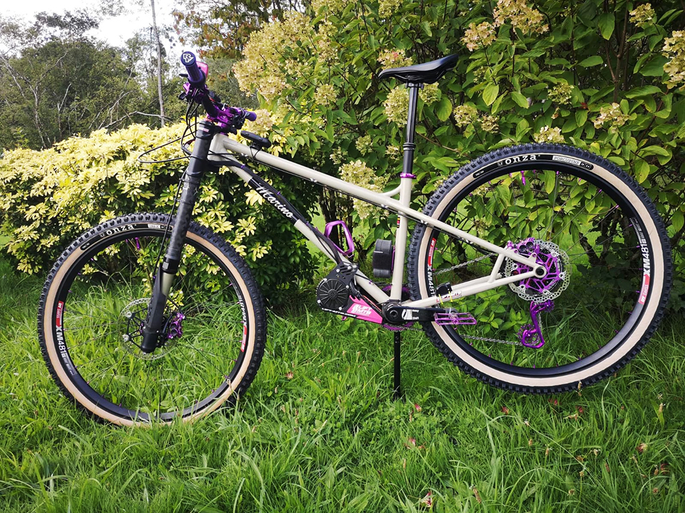 Hardtail Pinion mountSpec: Reynolds 520, headtube 44T -135mm lenght, Seattube gusset, BB 73mm BSA, Elevated rear triangle Color: Frame Purple Gloss, decalds pink strongDownload Bikecad – ask for mail